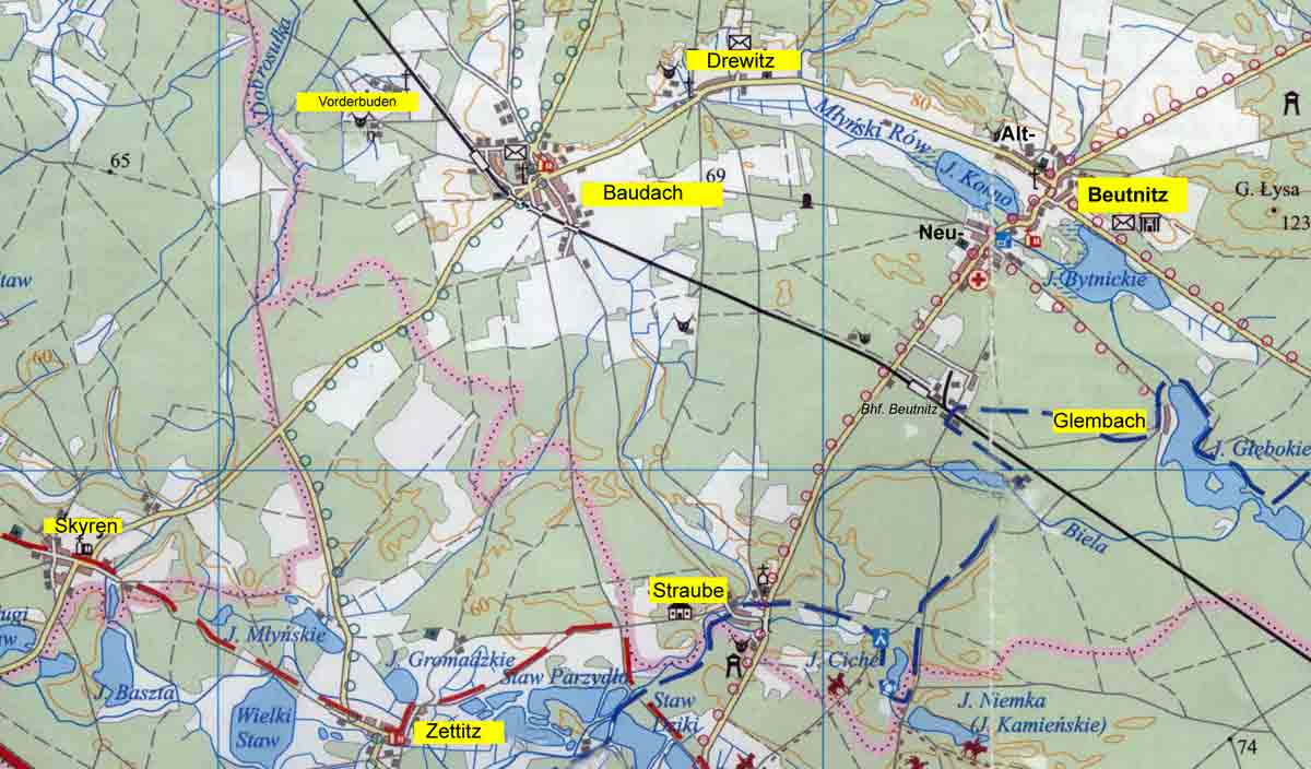 Zettitz (Czetowice) abbiegt.Nach 3km wird Zettitz passiert und nach weiteren 7 km ist man in Baudach angekommen