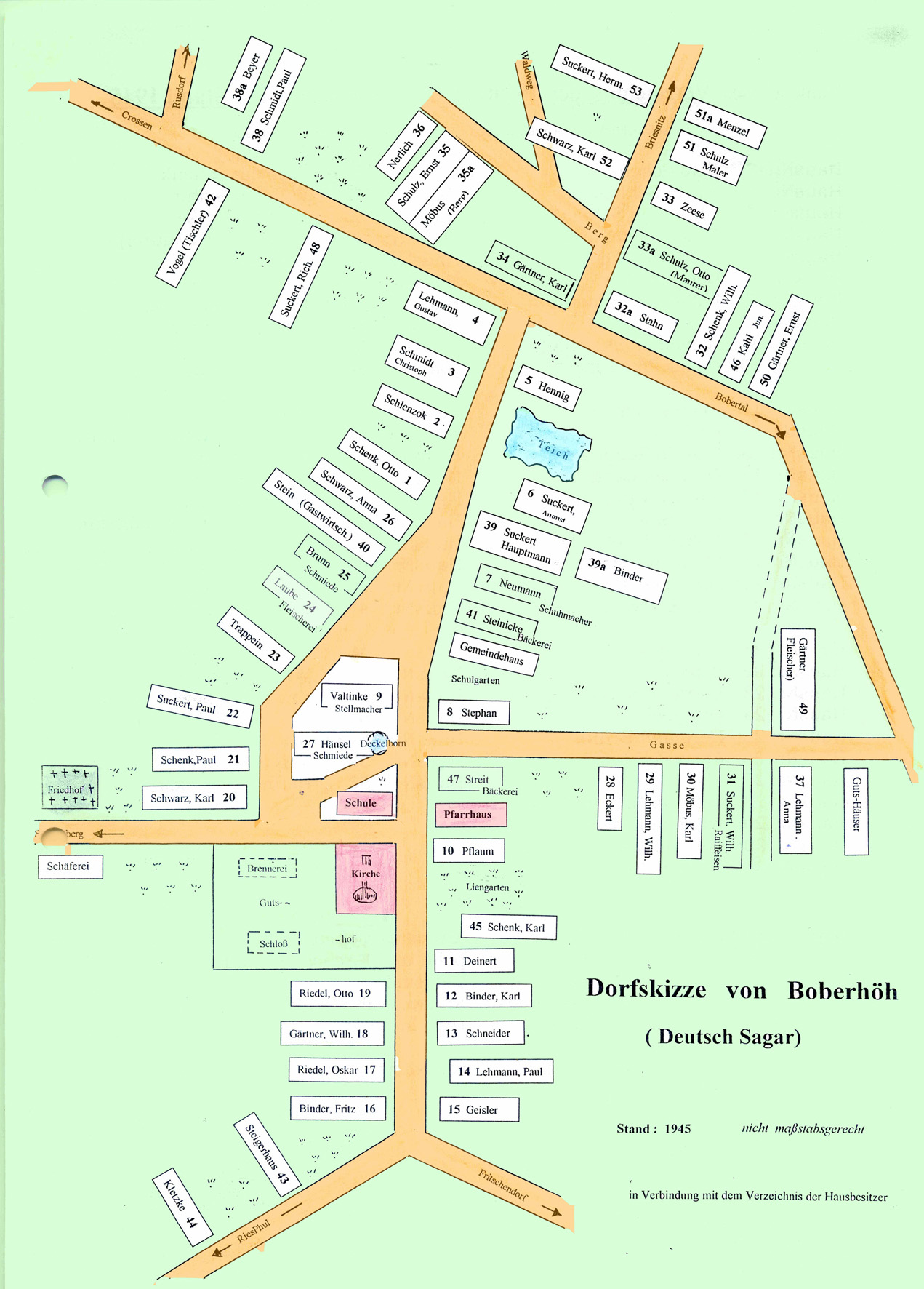 Nebenstehender Dorfplan zeigt den Bestand an Häusern mit ihren Hausnummern im Januar 1945. Allerdings hatten nicht alle Häuser in Deutsch-Sagar eine Hausnummer.