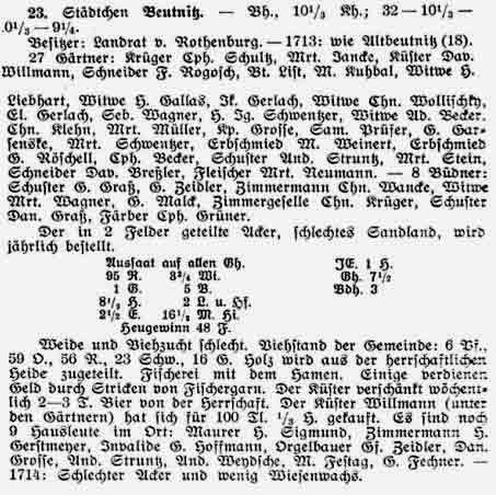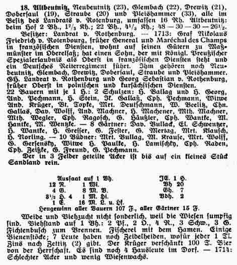 Alt-Beutnitz hatte 2 Lehnschulzen, 20 Bauern, 9 Ganz- und 12 Halb-Kossäten, 1 Büdner, 2 Einlieger und 1 Rademacher;