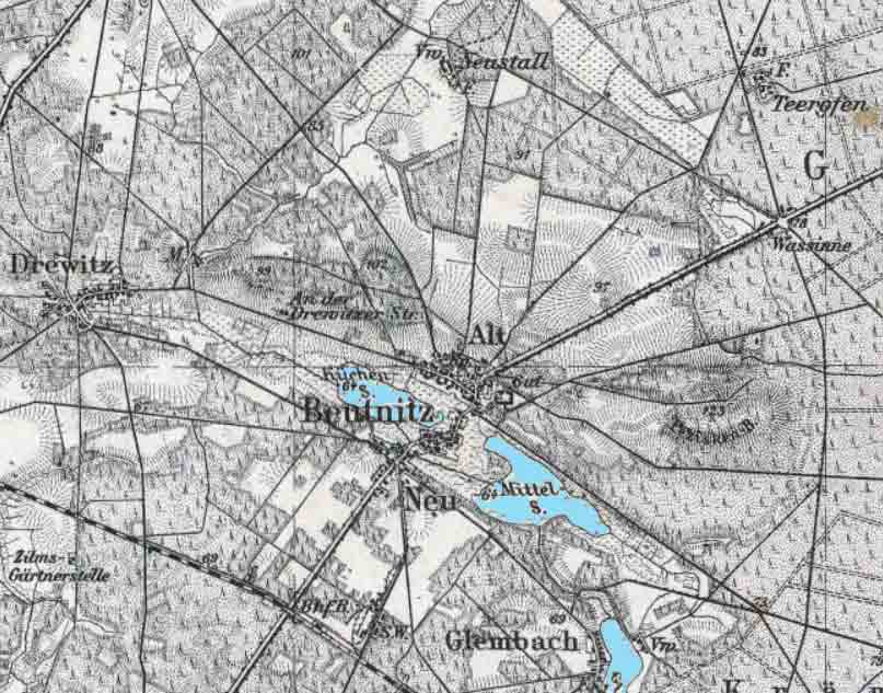 Alt-Beutnitz war ein Dorf mit 1 Forsthaus, 1 Schäferei 1 Teerofen und war eingepfarrt zu Neu-Beutnitz.