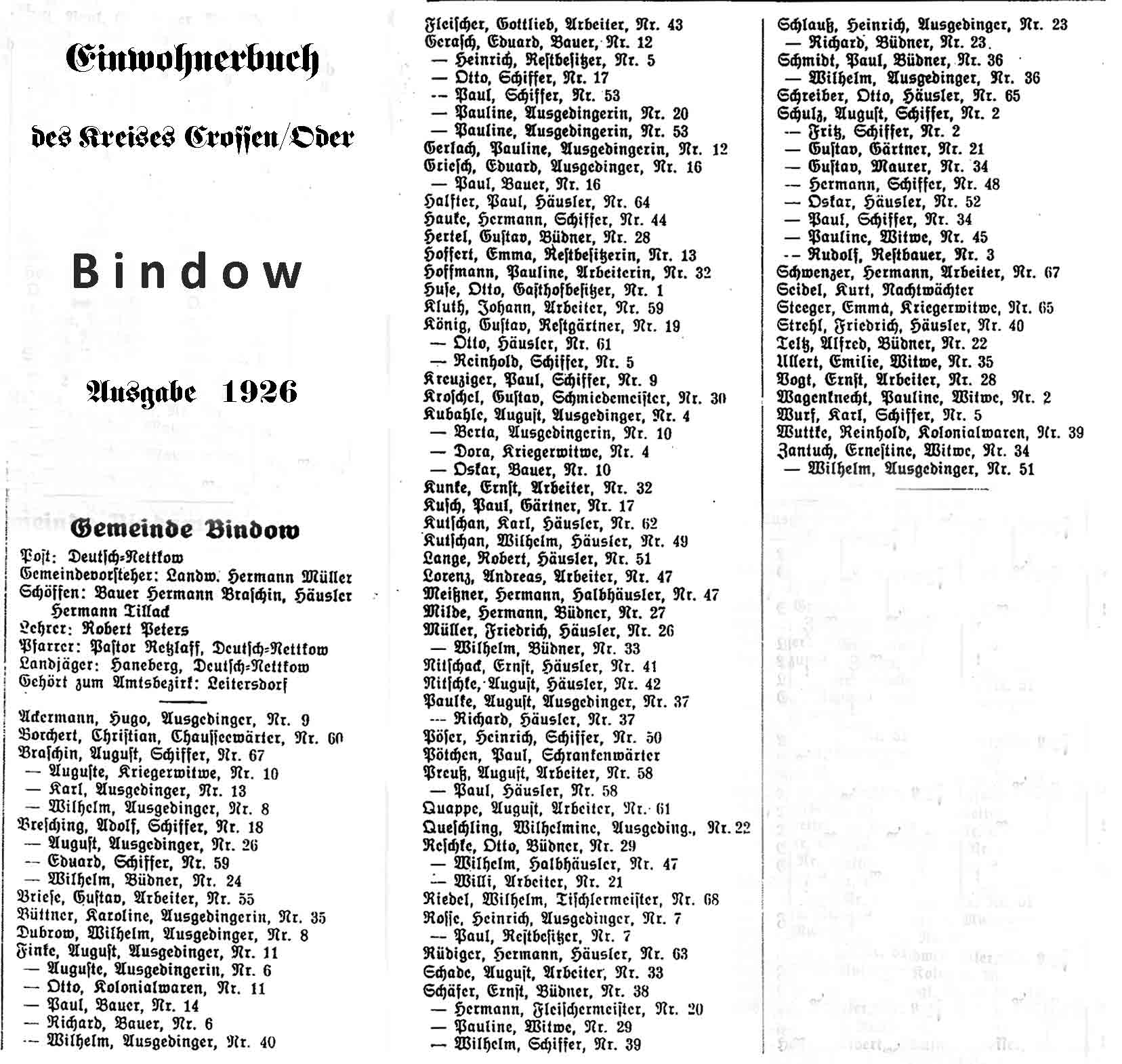 Für Bindow liegt uns leider weder ein Ortsplan noch ein Einwohnerverzeichnis vor. Als einzige noch verfügbare