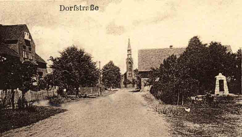 Dorfstraße mit Kirche - rechts das Kriegerdenkmal
