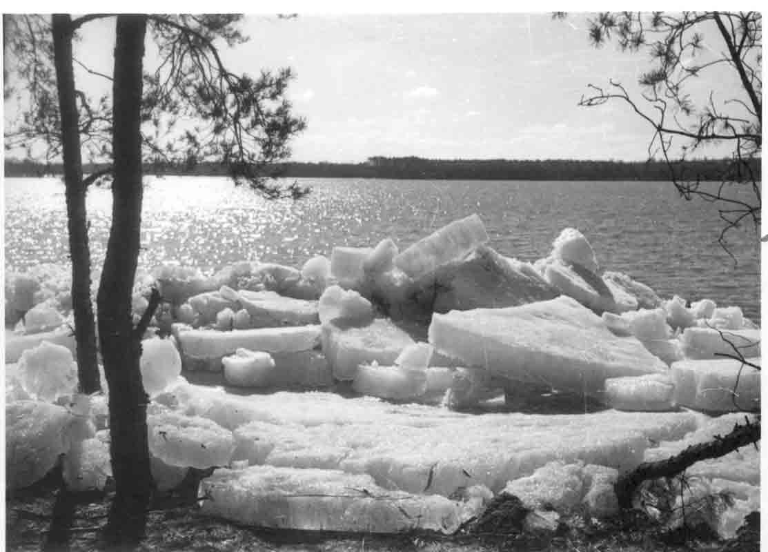 Eisblöcke, die die Strömung in den Wald schob