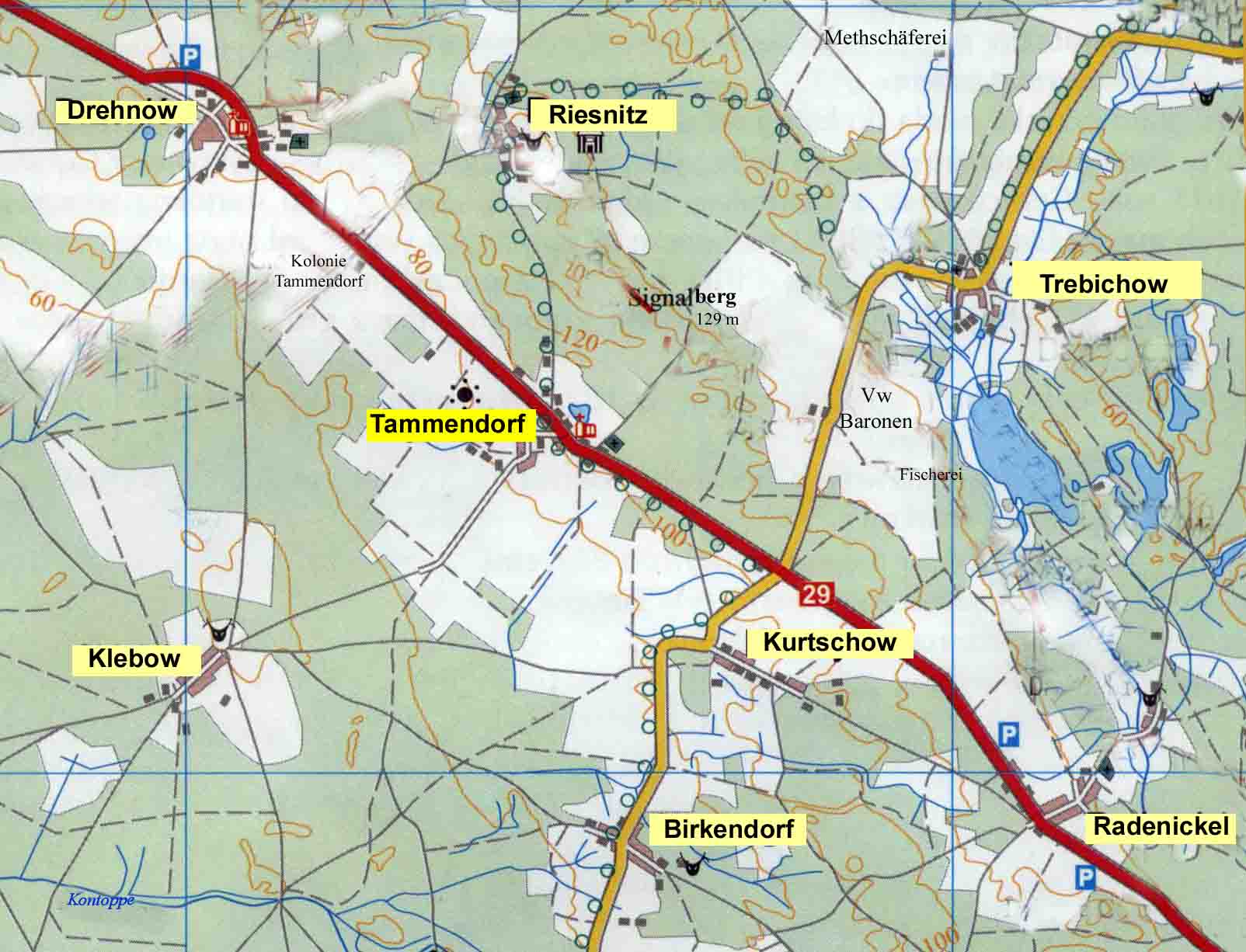 Er stand an der Fernstraße am Ortsausgang in Richtung Tammendorf.Der Gasthof zur fröhlichen Wiederkehr in der Dorfmitte am kleinen Kirchplatz gegenüber der ehemaligen herrschaftlichen Brennerei hat den Krieg überstanden. Dem Hauptgebäude angebaut befand sich der große Saal. Diese Bauanordnung fand und findet man praktisch in ganz Brandenburg. Zu Beginn des 20. Jahrhunderts gehörte der Gasthof Hermann Schulz. Hermann Schulz ist im ersten Weltkrieg gefallen, die Witwe Henriette heiratete in zweiter Ehe Adolf Materne, der damit den Gasthof übernahm. Zuvor war er Brenner in der herrschaftlichen Brennerei.