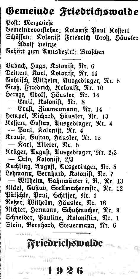 Friedrichswalde war im Jahre 1806 eine von 10 Kolonisten auf Königlich-Merzwieseschen Forstgrund angelegte Kolonie,