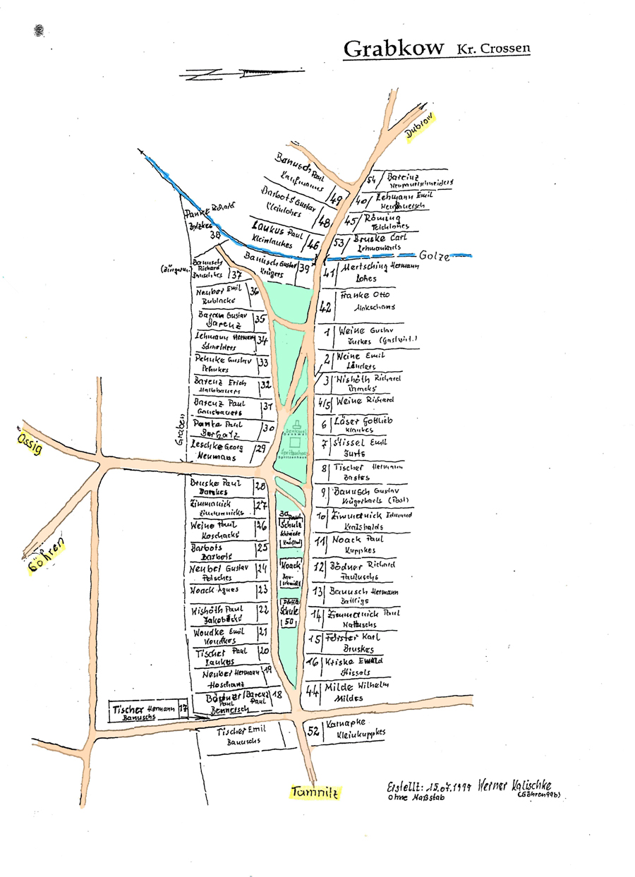 In der unten folgenden Tafel sind sämtliche mit einer Nummer versehenden Häuser von Grabkow mit ihren Bewohnern
