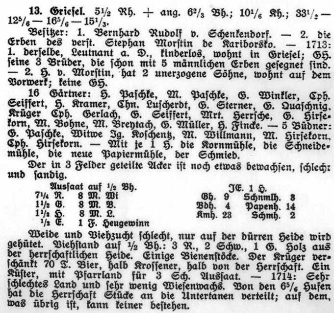 sind vermutlich im Laufe der Zeit verfälscht worden. Wissenschaftlich korrekt muss wohl von Unitariern die Rede sein. Heute erinnert nur noch der Arianer Teich daran, dass es hier früher eine Kultstätte der Wiedertäufer gab. In der Klassifikation 1718/19 wird Griesel wie folgt erwähnt: Die Besitzer des Gutes Griesel waren Bernhard Rudolf von Schenkendorf und die Erben des Stephan Morstin de Kariborsko. Leutnant a. D. von Schenkendorf war kinderlos, wohnte in Griesel. Seine drei Brüder hatten fünf Söhne. H. v. Morstin hatte zwei Söhne und wohnte auf dem Vorwerk. Im Ort gab es 16 Gärtner und 5 Büdner - aber keine Bauern. Je eine Hufe wurde von der Kornmühle, der Schneidemühle, der Papiermühle und der Schmiede bewirtschaftet. Die Felder wurden abwechselnd alle drei Jahre bestellt. Der Boden war schlecht und sandig. Weide und Viehzucht waren schlecht. Es wurde nur auf dürrer Heide gehütet.Die Gärtner, die im Durchschnitt eine halbe Bauernhufe bewirtschafteten, konnten drei Rinder, zwei Schweine und eine Gans halten.