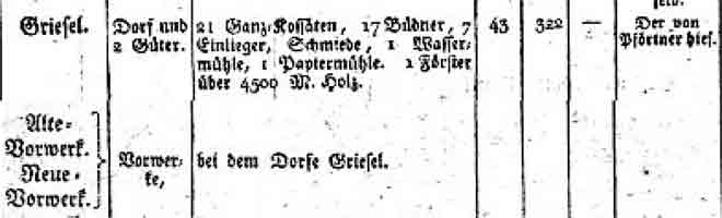 das zur Hälfte von der Gutsherrschaft und zur anderen Hälfte aus Crossen geliefert wurde. Das Schenkendorffsche Gut ging 1739 an Herrn von Wulffen und 1763 weiter an Ernst von Pförtner über. 1790 kam das der Witwe von Morstein gehörige Rittergut durch Zwangsverkauf in den Besitz des Herrn Andreas von Pförtner. Von nun an waren beide Güter in einer Hand. Im Bratring 1806 wird Griesel wie folgt erwähnt: Griesel war im Jahre 1806 ein Dorf mit 2 Gütern: • 21 Kossäten, 17 Büdner, 7 Einlieger, Schmiede. • 1 Wassermühle, 1 Papiermühle, 1 Förster. • Altes und Neues Vorwerk bei Griesel. • Griesel hatte 1806 43 Feuerstellen 322 Einwohner. In der “Topografischen Übersicht des Reg.Bez. Frankfurt/Oder” aus dem Jahre1840 erscheint: ♦ Griesel Dorf mit 1 Wassermühle, 1 Papiermühle, 1 Teerofen. außerdem ♦ Hintervorwerk = 1 Wohngebäude und 8 Einwohner.♦ Augustenhöhe = 21 Wohngebäude und 173 Einwohner. ♦ Mittelvorwerk = 1 Wohngebäude und 14 Einwohner. ♦ Vordervorwerk = 3 Wohngebäude und 25 Einwohner - wurde auch Morsteinvorwerk genannt.