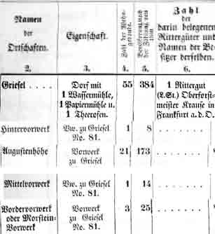 Für das Jahr 1852 werden genannt: ♦ Augustenhöhe = 188 Einwohner. ♦ Mittelvorwerk = 9 Einwohner. ♦ Vordervorwerk = 16 Einwohner - wurde auch Morsteinvorwerk genannt. Im Riehl und Scheu "Berlin und die Mark Brandenburg …" von 1861 wird geschrieben: ♦ Griesel hatte 57 Häuser 472 Einwohner, darunter 9 Katholiken, u. 7 Juden. mit Papiermühle = 1 Haus 9 Einw, Mahlmühle = 1 Haus 10 Einw, Schneidemühle = 2 Häuser 25 Einw. Der Besitzer war Oberforstmeister a.D. Krause. ♦ Hintervorwerk = 2 Häuser 16 Einwohner. ♦ Augustenhöhe = 18 Häuser 204 Einwohner, dar. 9 Katholiken. ♦ Mittelvorwerk = 1 Haus 6 Einwohner. ♦ Vordervorwerk = 4 Häuser 21 Einwohner.