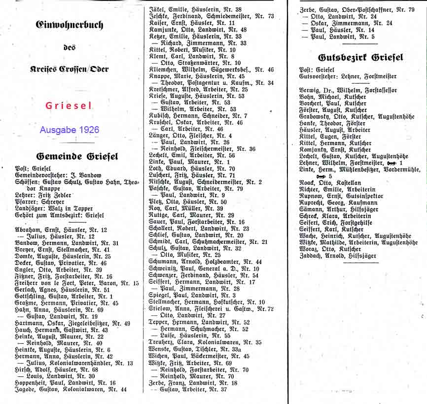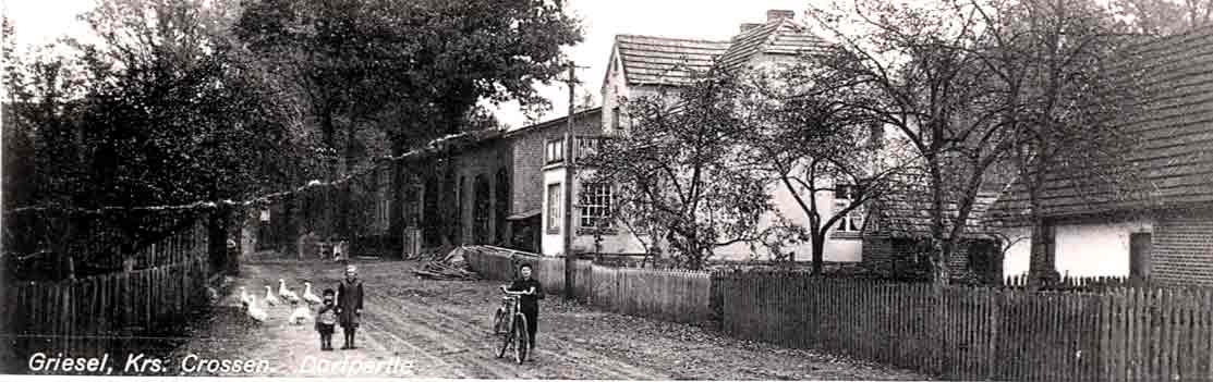 Griesel war ein Dorf im Kreis Crossen mit ca. 480 Einwohnern. Für Griesel liegt dem Webmaster ein Ortsplan mitzugehörigem Häuserverzeichnis vor. Dieser vom Landsmann H. Pfeifer entworfene Ortsplan wurde durch Annette Brown dem Webmaster übergeben Außerdem verfügen wir noch über das "Einwohnerbuch des Kreises Crossen/Oder - Ausgabe 1926". Im folgenden werden einige Angaben aus diesem Einwohnerbuch von 1926 nur kurzgefaßt wiedergegeben: • Die Hausnummern gingen bis 79 An der oberen Dorfstraße gab es damals noch das Kolonialwarengeschäft Hermann (vorher Treuherz).