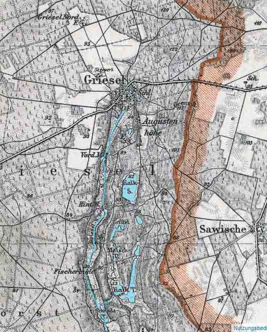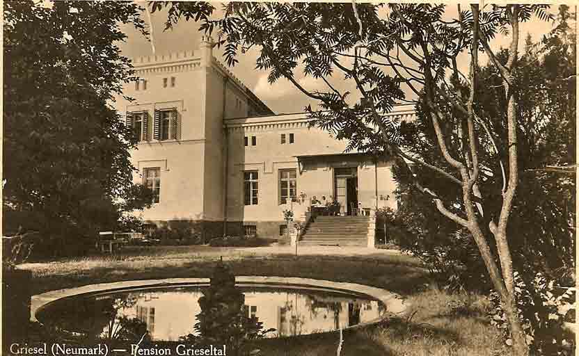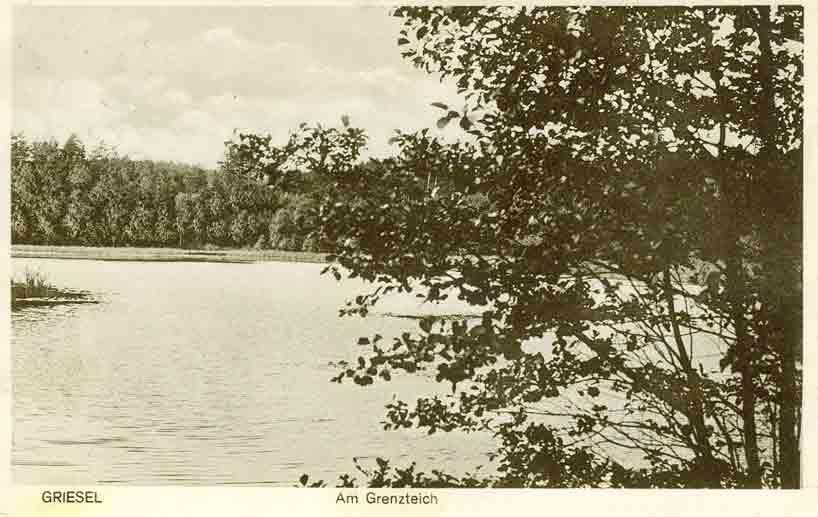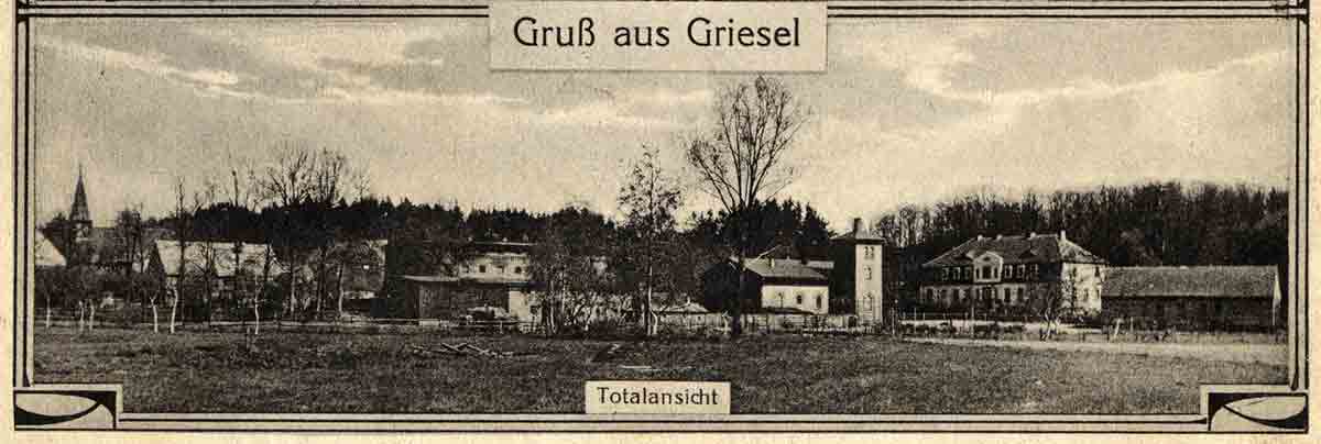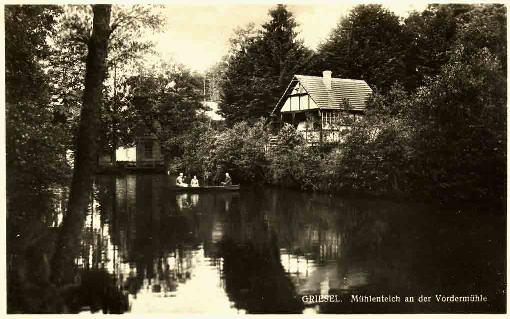 lieferten das Feuerholz. ♦ VordermühleSüdwestlich der Augustenhöhe am Flüsschen lagen zwei weitere Gebäudegruppen. Vom Westausgang des Dorfes führte ein gut 1000 m langer Weg zur Vordermühle. Das idyllisch am Mühlenteich gelegene sogenannte Entenhäuschen nahm schon in den 1920er Jahren Sommerfrischler auf. Diese älteste und früher einzige Grieseler Mahlmühle mit Ölpoche, kaufte Gottfried Klopsch mit Genehmigung der Gutsherrschaften im Jahr 1694. Sie blieb in den Händen seiner Nachkommen bis 1945. Kaufverträge von 1694 bis 1923 und andere zahlreiche Urkunden waren noch hier vorhanden. Die Schneidemühle am anderen Ufer, die gepachtet war, stand bis zum Jahr 1880 in herrschaftlichem Besitz und musste von dem überschüssigen Wasser durch den Müllermeister Klopsch betrieben werden. Um die Mitte des 19. Jahrhunderts, zu Griesels Blütezeit, herrschte in der Vordermühle ein geselliges Leben und Treiben. Wer ein paar gemütliche Stunden verleben wollte, ging nach der Mühle, wo auch Getränke gegen Bezahlung verabreicht wurden. Das junge Volk fand hier in der alten, großen Mahlstube oft Gelegenheit zu einem Tänzchen.Die alten Herren spielten im Hinterstübchen Schafskopf und die Frauen hielten ein Plauderstündchen mit dem Spinnrocken oder dem Strickstrumpf. Die Mühle hatte auch eine viel benutzte Kegelbahn und einen Schießstand, auf dem öfters Übungsschießen stattfanden, wozu der alte Mühlenmeister Klopsch, der Unteroffizier war, die alten gedienten Soldaten der Umgegend einberief. ♦ Mittelmühle