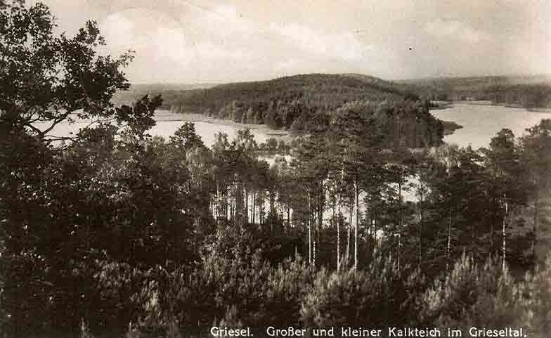 Etwa 1 km abseits des Dorfes Griesel, östlich vom Grieseltal, liegt der bis 23 m tiefe Kalksee mit seinem klaren, durchsichtigen Quellwasser. Der Abfluß verläuft in südlicher Richtung und speist eine Reihe von Karpfenteichen: den Seeteich, den Zeidelteich, den Metschteich und den kleinen Kalksee. Eine zweite Reihe von Teichen - Grenzteich, schwarzer Teich, Quellteich und großer Kalkteich - hat ihren Ausgang kurz unterhalb des Kalksees, von diesem durch eine hohe Bergbarriere getrennt.Diese Teichkette verläuft ebenfalls in südlicher Richtung und vereinigt sich beim Blockhaus Krämersborn mit dem kleinen Kalkteich, dessen Abfluß durch den Langen Halsteich in den Schneideteich geht. Im Grieselfließ vereinigen sich die Gewässer beider Teichtäler.