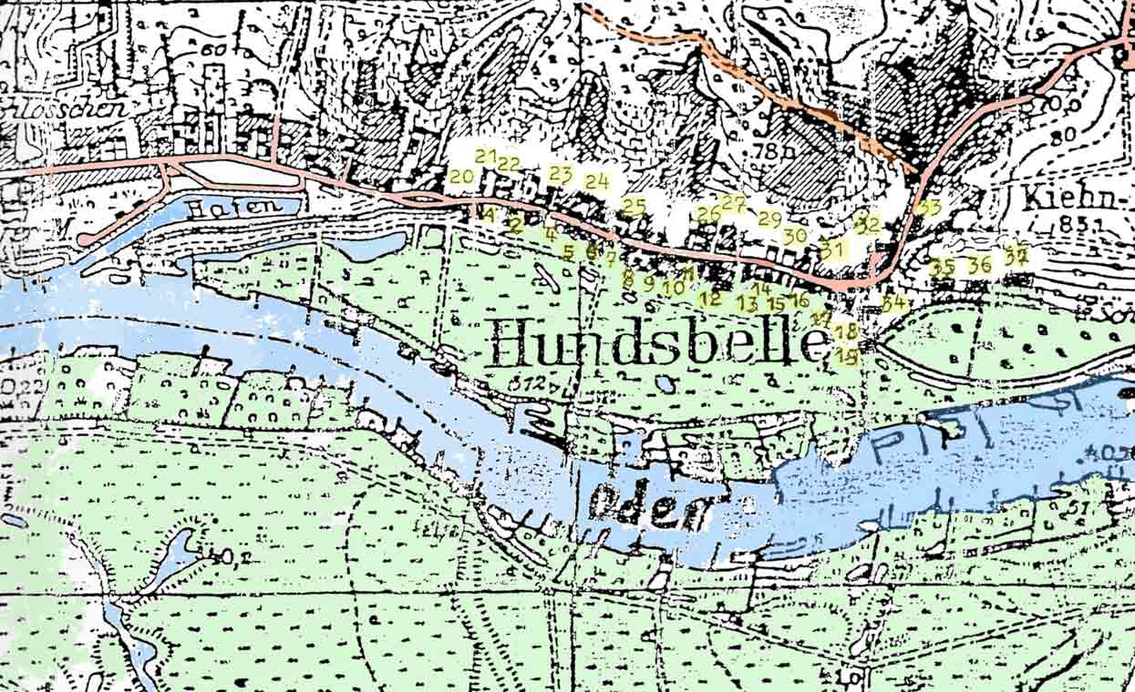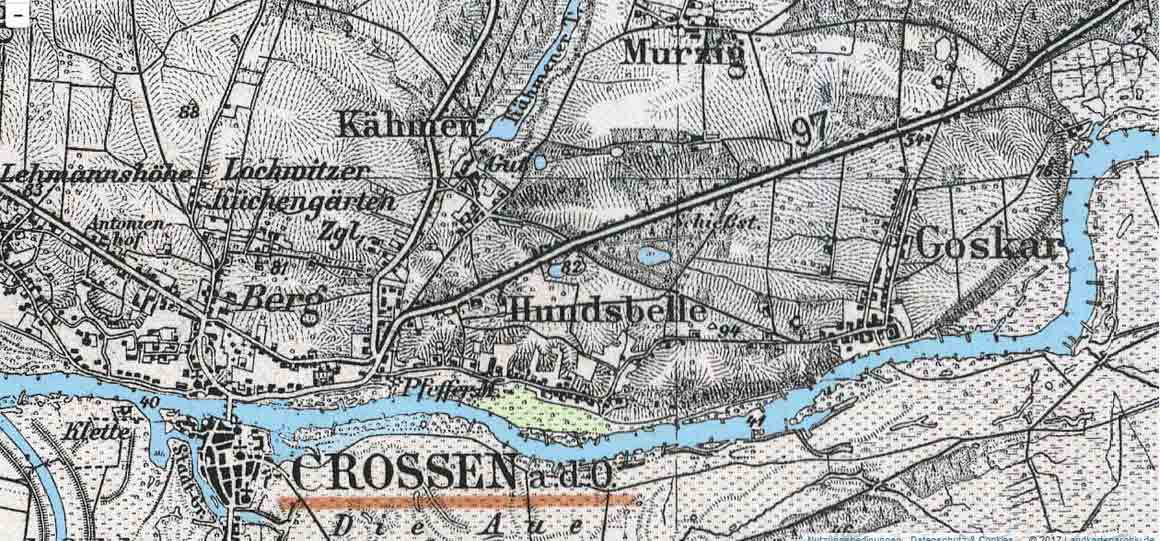 Von Markt in Crossen/Oder kommend, erreicht man Hundsbelle, indem man nach Überqueren der Oderbrücke rechts auf die Bismarckstr.