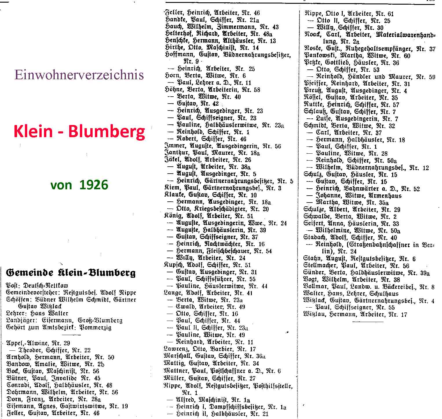 Klein Blumberg im Einwohnerbuch Krs. Crossen 1926
