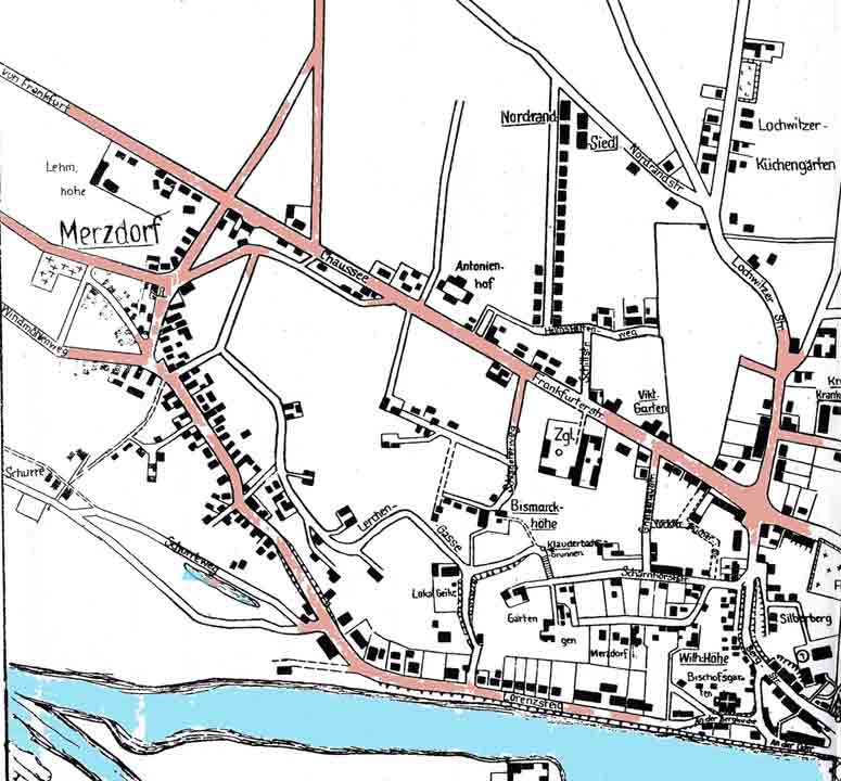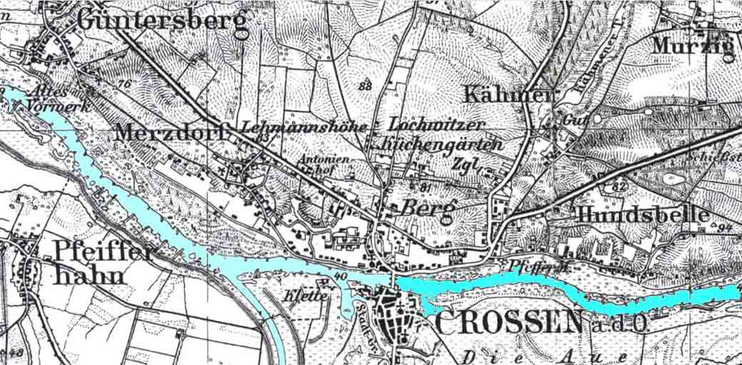 oder in den städtischen Gärten gen Merzdorf. Die Grenze zwischen Crossen und seinem nordwestlichen Nachbardorf verlief ja sehr