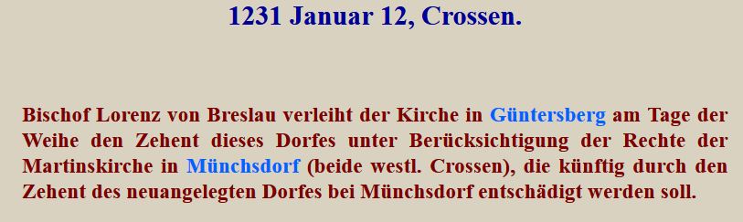 gegründet, und von Crossener oder Güntersberger Mönchen erbaut. Diese Siedlung - bereits 1202 urkundlich erwähnt - wurde