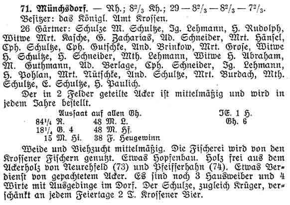 "Mönchsdorf " genannt und lag dicht an der Oder.1226 wurde die Martinskirche geweiht. 1530 wurde das Dorf Münchsdorf mit der Propstei Güntersberg verkauft. Im 17. Jahrhundert kam die Ortschaft an das kurfürstliche Domänenamt Crossen. In der Klassifikation 1718/19 wird Münchsdorf wie folgt erwähnt: Münchsdorf war ein reines Kossätendorf und gehörte zum Domänenamt Crossen. Im Ort gab es die keine Bauern, sondern nur 26 Gärtner, Alle Gärtner wurden namentlich aufgeführt (siehe nebenstehenden Auszug). Während die Trebnitzer Zisterzienserinnen in ihrem "Nonnendorf" von Anfang an die bäuerliche Wirtschaftsform förderten, ließen Gegensatz dazu die Mönche von Leubus, die in Güntersberg und Münchsdorf tätig waren, nur Kossäten (Gärtner) zu. Der Acker, Weide und Viehzucht waren mittelmäßig, und es wurden Roggen, Gerste, Hirse, Leinen und Hanf angebaut. Der Heugewinn betrug 38 Fuder. Die Krossener Fischer nutzten die Fischerei. Es wurde auch etwa Hopfen angebaut. Aus dem Ackerholz von Neurehfeld und Pfeifferhahn konnte das Holz frei bezogen werden. Der zusätzlich gepachtete Acker brachte etwas Nebenverdienst. Im Dorf gab es noch drei Hausweiber und vier Wirte mit Ausgedinge. Der Schulze war auch der Krüger. Allerdings wird dort recht ausführlich von der Oderflut vom August 1854 berichtet (siehe weiter unten). Im Bratring 1806 wird Münchsdorf wie folgt erwähnt: ![]() Münchsdorf war im Jahre 1806 ein Kossätendorf. Es hatte 26 Kossäten (Gärtner), 1 Büdner und 5 Einlieger. Münchsdorf hatte 1806: 28 Feuerstellen 187 Einwohner. In der “Topografischen Übersicht des Reg.Bez. Frankfurt/Oder” aus dem Jahre 1844 erscheint: ♦ Münchsdorf war Dorf - zum Rentenamt Crossen gehörig. ♦ es hatte 35 Wohngebäude und 309 Einwohner. Für das Jahr 1852 werden genannt: Münchsdorf hat 330 Einwohner = Dorf zum Rentenamt Crossen gehörig.