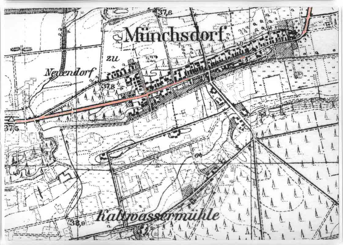 aus dem Jahr 1854 wird Münchsdorf nicht erwähnt. Es gehörte nicht zu den Gutsdörfern!Münchsdorf lag früher direkt an der Oder und wurde oft von Hochwasser überflutet. Es wurde nach 1854 ca. 1 ½ km von der Oder weg verpflanzt. Nach seinem Wiederaufbau entwickelte sich Münchsdorf zu einem langgestreckten, einseitig bebauten Straßendorf von über ein Kilometer Länge. Der Ort zählte zuletzt mit der eingemeindeten Domäne Sorge zusammen über 600 Einwohner. Haupteinnahmequellen des Dorfes sind die Forst- und Landwirtschaft. Bis in die jüngste Zeit fuhren die Münchsdorfer auf dem "Teichweg" ins "ahlde Durf" zu ihren Feldern an der Oder. S t r i e m i n g - D ö r f e r ⇒