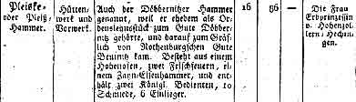 Pleiskehammer war im Jahre 1806 ein Hüttenwerk u. Vorwerk - es gehörte der Erbprinzessin von Hohenzollern-Hechingen.