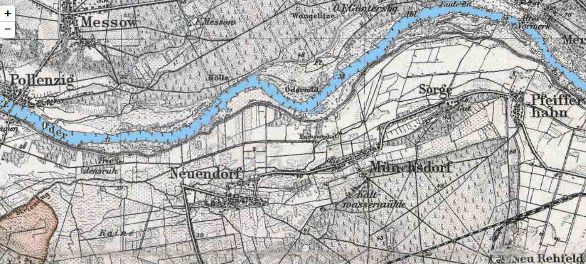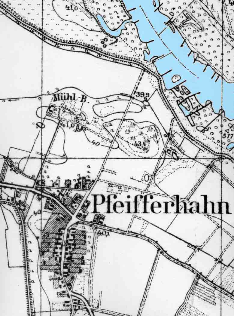aus dem Jahr 1854 wird Pfeifferhahn nicht erwähnt. Es gehörte nicht zu den Gutsdörfern!Pfeifferhahn hatte bei der letzten Volkszählung im Jahre 1939 325 Einwohner und gehörte zum Amtsbezirk Sorge. Das Dorf Pfeifferhahn, dem diese Seite gewidmet ist, liegt am südlichen Rand des Oder-Urstromtals etwa 2 km westlich der Bobermündung. Der in den 1930er Jahren neu angelegte Boberdeich und der verstärkte Oderdamm, an dem sie seit uralten Zeiten Hand- und Spanndienste hatten leisten müssen, schützten nun besser als zuvor ihre fruchtbarsten Äcker. Wenn Pfeifferhahn auch klein war, so zählte es doch zu den schönsten Dörfern des ganzen Kreises. Lindenbäume säumten zu beiden Seiten die Dorfstraße. Vor den schmucken Häusern war meist eine Treppe, oder es stand eine Bank davor, auf der sich im Sommer nach getaner Arbeit alt und jung niederließen. Da war der alte Schlumpgraben mit seiner Brücke, auf deren Geländer das junge Volk bis in die Nacht hinein saß. Von Neurehfeld kommend, fließt der Heidegraben an Pfeifferhahn vorbei, um später vom Strieming aufgenommem zu werden. Der andere Hauptquellbach des Strieming kommt vom Kempfensee und aus der Braschener Gemarkung. Er schlängelt sich am Ostrand Merzwieses vorbei zur Kaltwassermühle, um dann nördliche und vom Fuchswinkelsee aus westliche Fließrichtung anzunehmen.