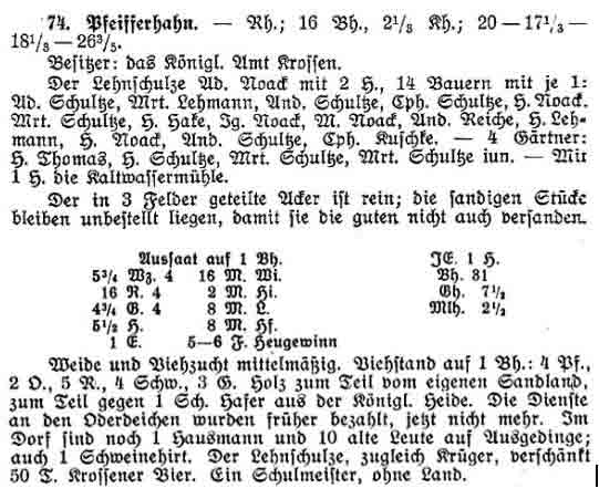 Piastenherzögen, ab 1482 dann zum kurfürstlich-königlichen Amt Crossen gehörte.Solche Amtsdörfer blieben frei von einem Gutsherren und damit von adligen Familien, die hätten ein Schloß erbauen und Urkunden hinterlassen können. Der Amtmann des Landesherren bediente sich bei der Verwaltung des Dorfes lediglich eines Lehnschulzen. Pfeifferhahn lag zudem wie Neu-Rehfeld so nahe an Crossen, daß es keine Kirche bekam. Die Einwohner gehörten zur städtischen Sankt Mariengemeinde. Sicherlich gingen sie lange Zeit über die Wiesen des Amtsvorwerks Klette und den Bobersteg zu Fuß zum Gottesdienst und zurück. Weiter verband sie die Alt-Rehfelder Brücke mit der Kreisstadt und deren Bahnhof. In der Klassifikation 1718/19 wird Pfeifferhahn wie folgt erwähnt: Pfeifferhahn war ein reines Bauerndorf und gehörte zum Domänenamt Crossen. Im Ort gab es die 14 Bauern mit je 1 Hufe Land, und 4 Gärtner (Kleinlandwirte). Alle Bauern und Gärtner wurden namentlich aufgeführt (siehe nebenstehenden Auszug). Neben dem Lehnschulzen Adam Noack gab es also 14 Bauern mit jeweils einer Hufe Land. Eine Hufe bewirtschaftete die Kaltwassermühle. Es gab einige versandete Feldstücke, die nicht bestellt werden konnten, weil sie die anderen Felder auch versandet hätten. Weide und Viehzucht waren mittelmäßig. Auf einer Bauernhufe konnten vier Pferde, zwei Ochsen, fünf Rinder, vier Schweine und drei Gänse gehalten werden. Holz wurde zum teil aus dem versandeten eigenem Land und teils für einen Scheffel Hafer von der Königlichen Heide bezogen. Die Dienste an den Oderdeichen wurden früher bezahlt, doch dann nicht mehr. Im Dorf gab es noch einen Hausmann, einen Schweinehirten, einen Schulmeister ohne Land und zehn alte Leute auf Ausgedinge. Der Lehnschulze war zugleich Krüger und verschenkte 7.500 Liter Krossener Bier im Jahr. Angebaut wurden auch hier Weizen, Roggen, Gerste, Hafer, Erbsen, Hirse, Leinen, Hanf und Wicken. Jeder Bauer erntete bis sechs Fuder Heu. Interessant ist hier die Angabe, daß der einzelne Bauer damals auf seiner Hufe im Durchschnitt vier Pferde, zwei Ochsen, fünf Rinder und vier Schweine hielt. Er war damit hinsichtlich der Pferdezahl im Verhältnis zu den Bauern in vielen anderen märkischen Dörfern "reich". Wahrscheinlich benötigte er die Zugtiere, um den feuchten Boden hinterm Oder- und Boberdamm zu beackern Allerdings wird dort recht ausführlich von der Oderflut vom August 1854 berichtet, die auch Pfeifferhahn verwüstete. (siehe weiter unter Münchsdorf und Sorge). Im Bratring 1806 wird Pfeifferhahn wie folgt erwähnt: ![]() Pfeifferhahn war im Jahre 1806 ein Dorf mit einer Wassermühle. Es hatte ein Lehnmann, 13 Bauern, 4 Kossäten (Gärtner), 4 Büdner oder Deichknechte, 2 Einlieger,1 Dammeister. Pfeifferhahn hatte 1806: 25 Feuerstellen 170 Einwohner. In der “Topografischen Übersicht des Reg.Bez. Frankfurt/Oder” aus dem Jahre 1844 erscheint: ♦ Pfeifferhahn war Dorf - zum Rentenamt Crossen gehörig. ♦ es hatte 32 Wohngebäude und 223 Einwohner. ♦ die Kaltwassermühle bestand aus 2 Häusern mit 13 Einwohnern. Für das Jahr 1852 werden genannt: Pfeifferhahn hat 233 Einwohner = Dorf zum Rentenamt Crossen gehörig, und die Kaltwassermühle mit 16 Einwohnern.