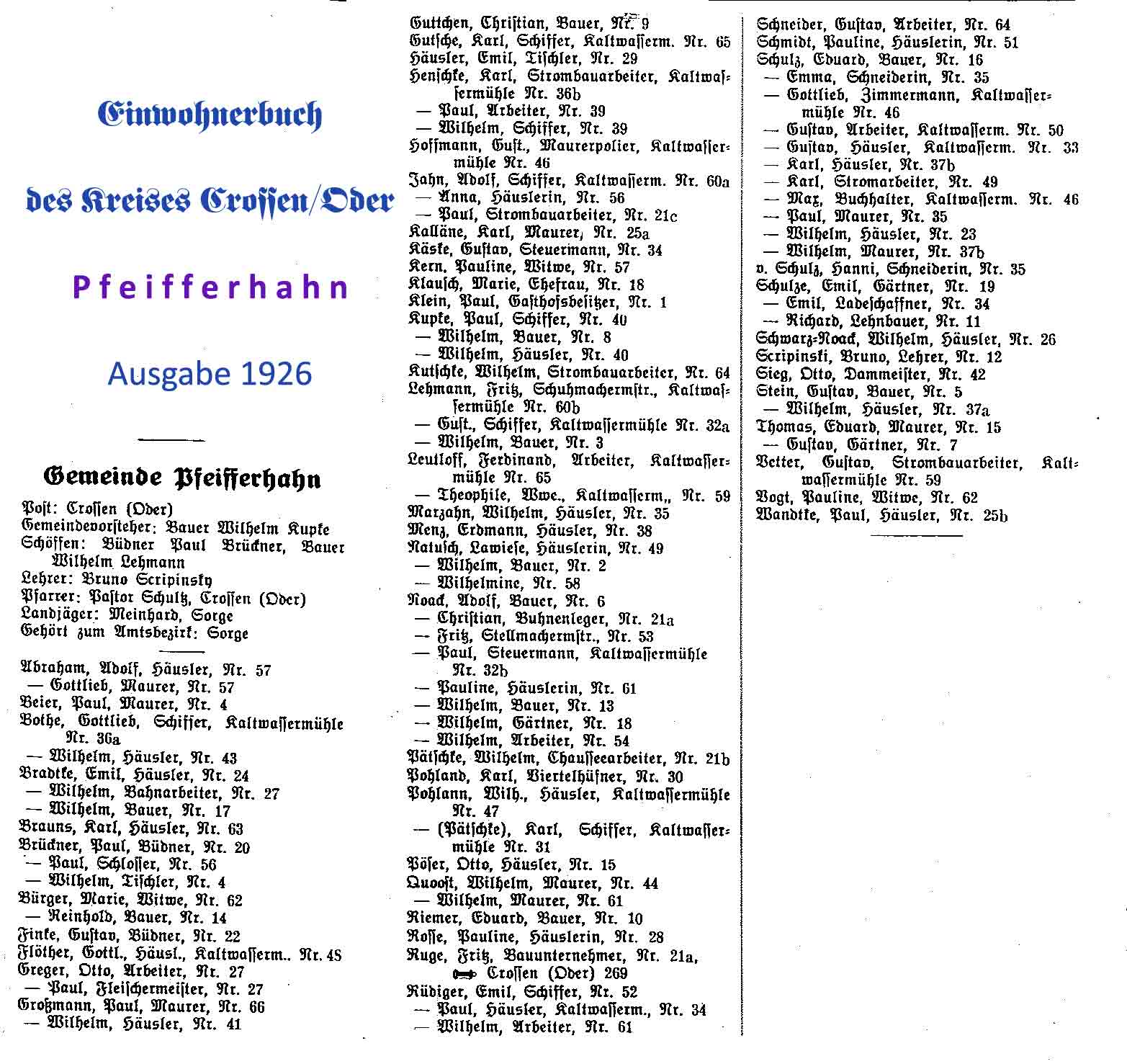 gern aufgesucht wurde und es natürlich auch eine Schule gab (1926: Lehrer Bruno Scripinsky).Laut "Einwohnerbuch des Kreises Crossen/Oder - Ausgabe 1926" war in Pfeifferhahn 66 die höchste Hausnummer. d.h. es existierten in deutscher Zeit mindestens 66 Häuser.Viele Häuser trugen auch ein angehängtes a oder b. Die darin enthaltenen Angaben werden im folgenden nur kurzgefaßt wiedergegeben. Es war ein echtes “Bauern- und Schifferdorf”. Das Einwohnerbuch liefert: • 12 Einträge als Landwirt, • 11 Einträge als Schiffer, Pfeifferhahn hatte in der ersten Hälfte des 20. Jahrh. eine gute Infrastruktur. Die Hauptberufe der Bewohner waren neben der Landwirtschaft und der Schiffahrt die Handwerker. Ohne Anspruch auf Vollständigkeit wurden im Einwohnerbuch von 1926 genannt: