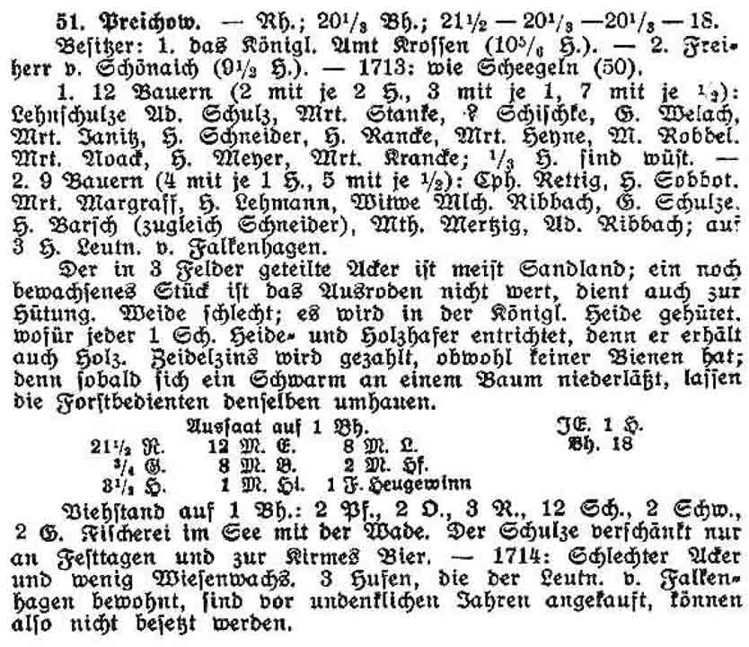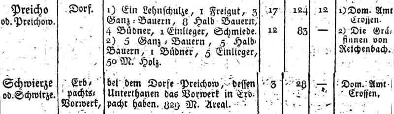 Preichow = Dorf Adliger Anteil= 13 Häuser 97 Einwohner - königl. Anteil= 36 Häuser 199 Einwohner.