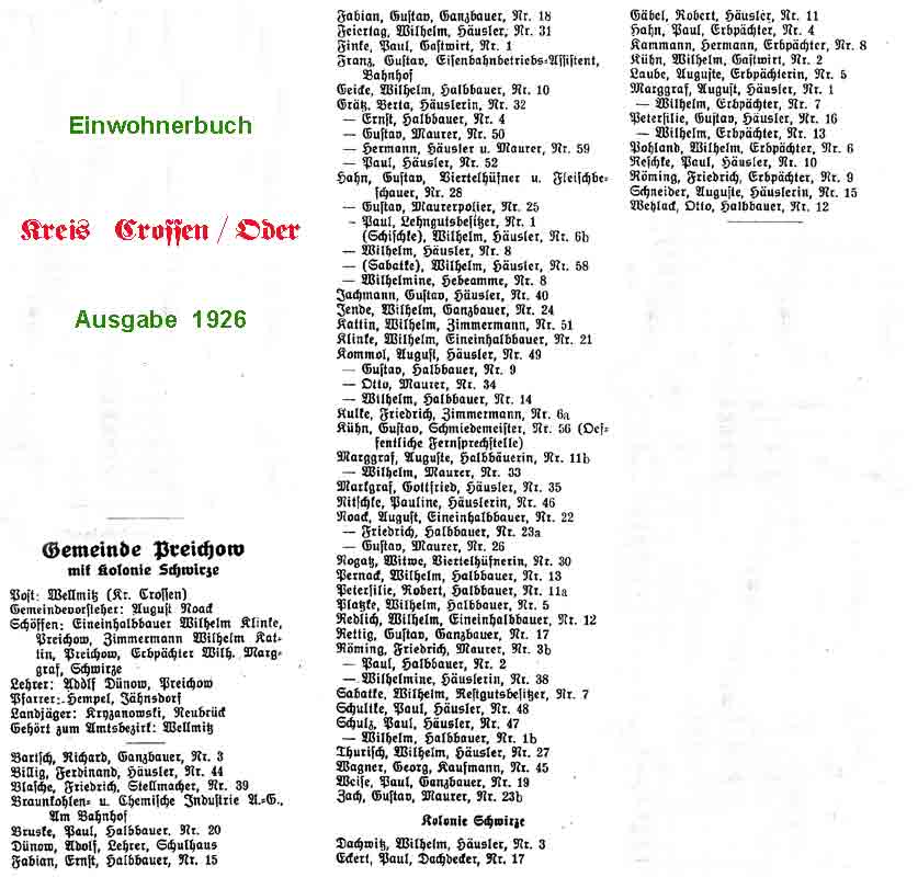 Preichow war ein Dorf im Kreis Crossen mit ca. 330 Einwohnern. Für Preichow liegt dem Webmaster