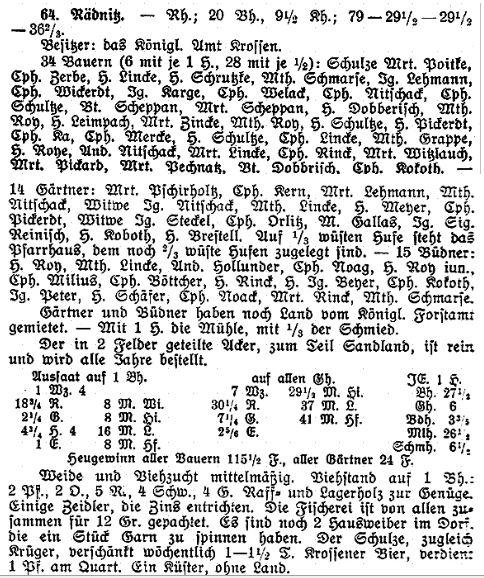 Rädnitz war ein Dorf mit 1 Wassermühle; zum Rentenamt Crossen gehörig.