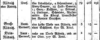 Groß Rädnitz: ein Vorwerk; 1/2 Meile von Rädnitz; mit einer Schäferei. 3 Häuser mit 13 Einwohnern