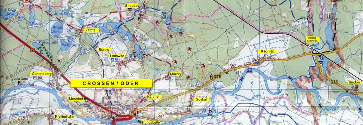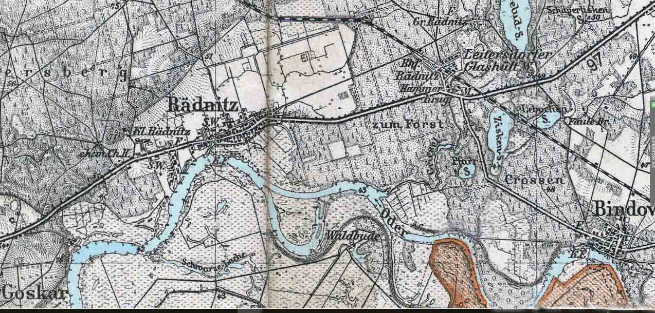 Es bestand ja etwa 14 Tage nördlich der Oder von Crossen ein Brückenkopf bis Kähmen. Deshalb orgelten die Granaten über Rädnitz hinweg,
