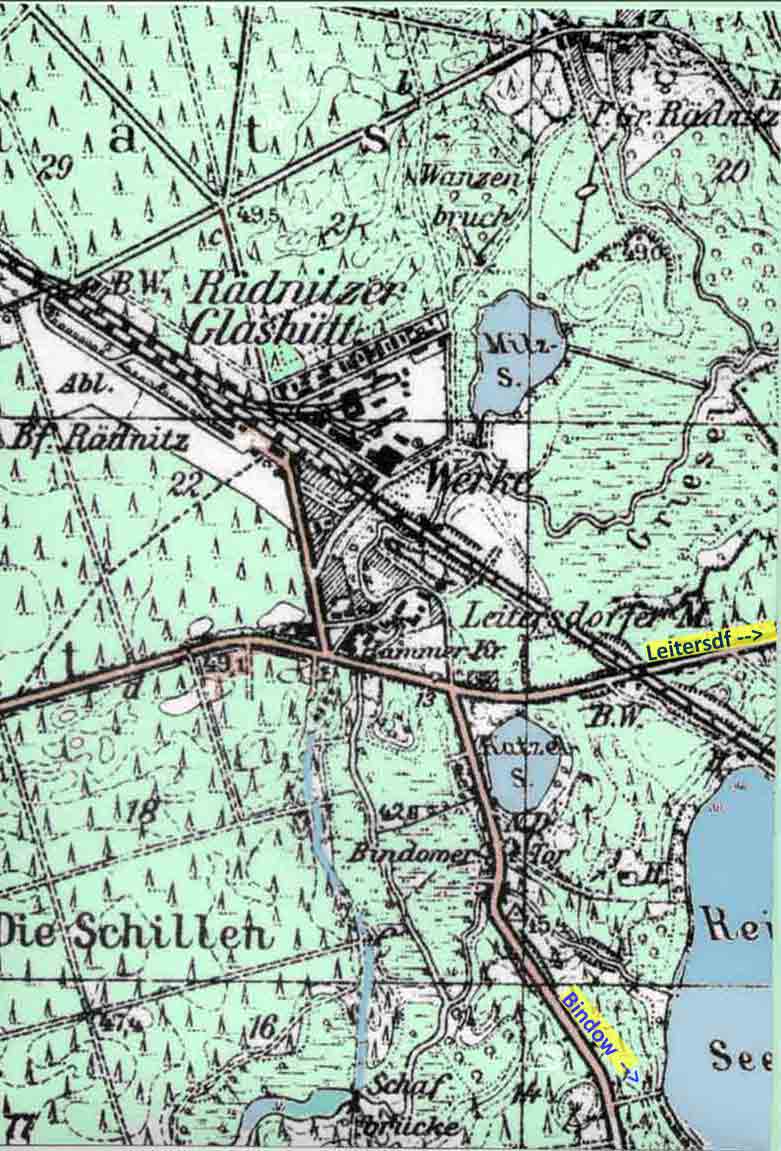 südwestlich der Försterei Groß-Rädnitz und ca. 500 m von der Chaussee (Reichsstr. 97) nach Schwiebus und Züllichau entfernt.
