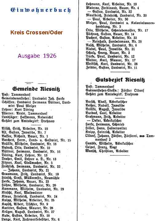 Dem Webmaster stand deshalb für Riesnitz neben dem "Einwohnerbuch des Kreises Crossen/Oder -