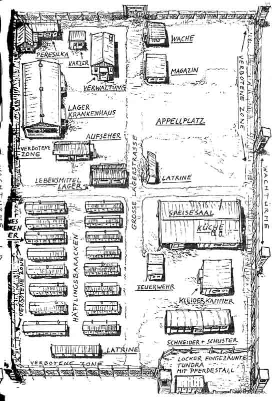 Unser Lager umfaßte mehrere Holzbaracken und war von einem über zwei Meter hohen undurchsichtigen