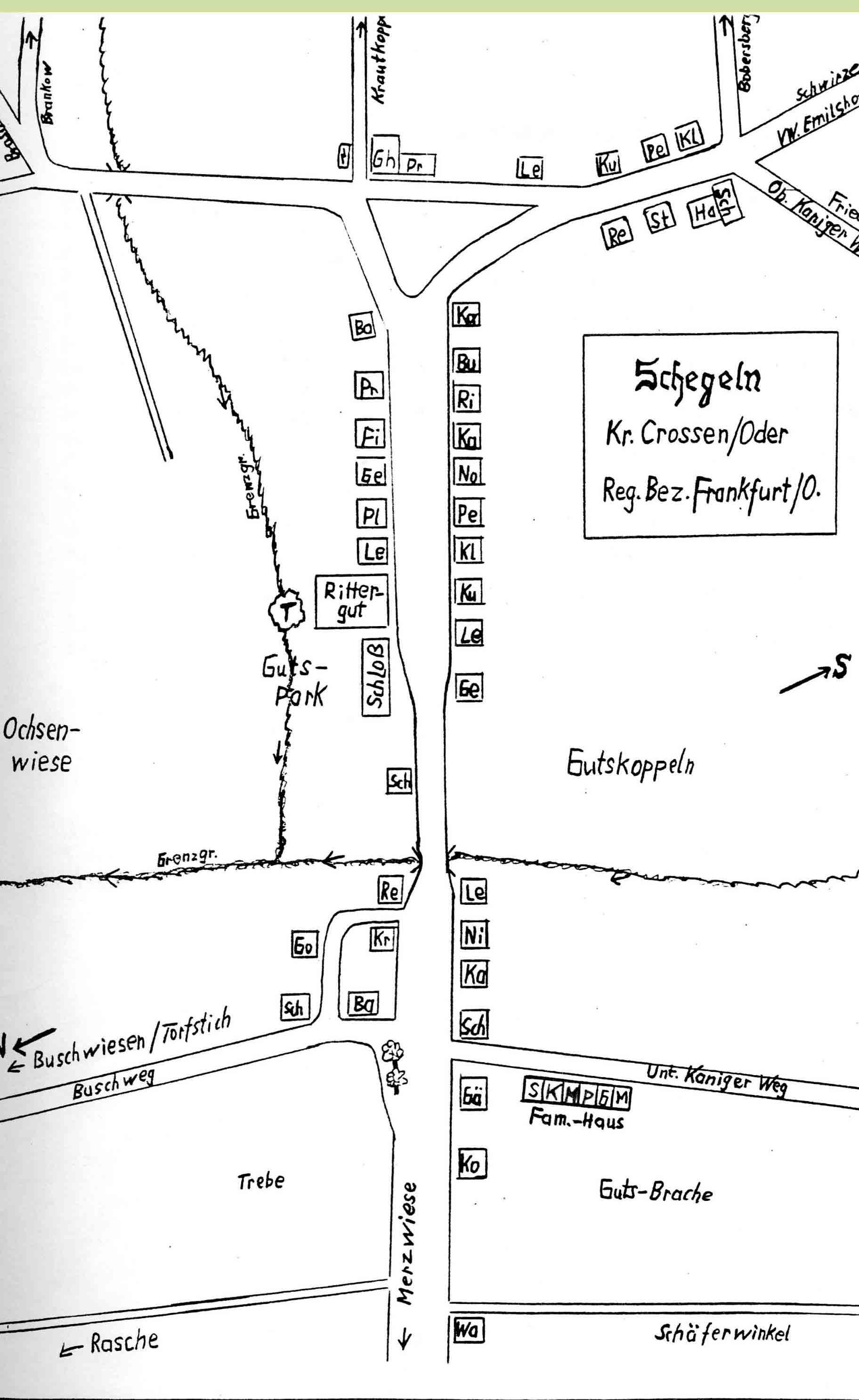 Scheegeln war eine kleine Gemeinde des Kreises Crossen/Oder und hatte bei der letzten Volkszählung im Jahre 1939