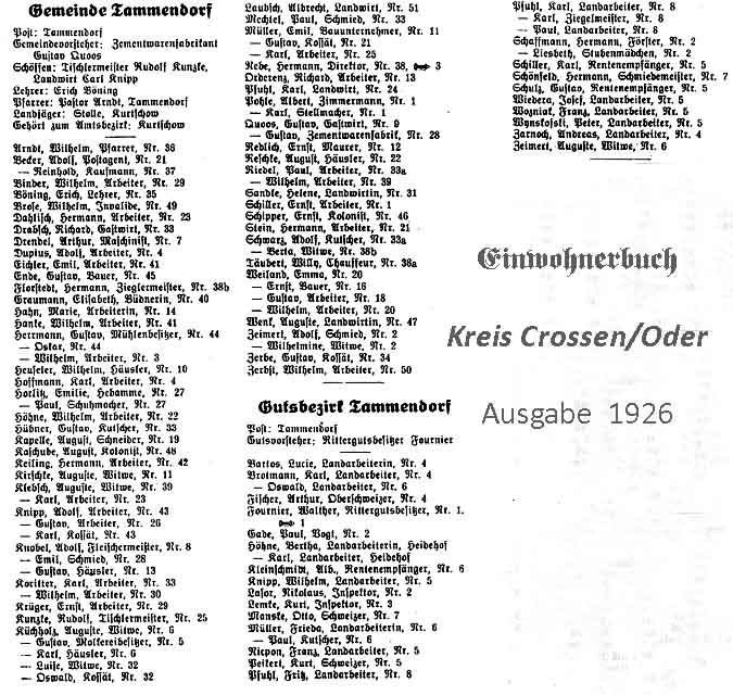 Dem Webmaster stand aber für Tammendorf neben dem "Einwohnerbuch des Kreises Crossen/Oder - Ausgabe 1926"