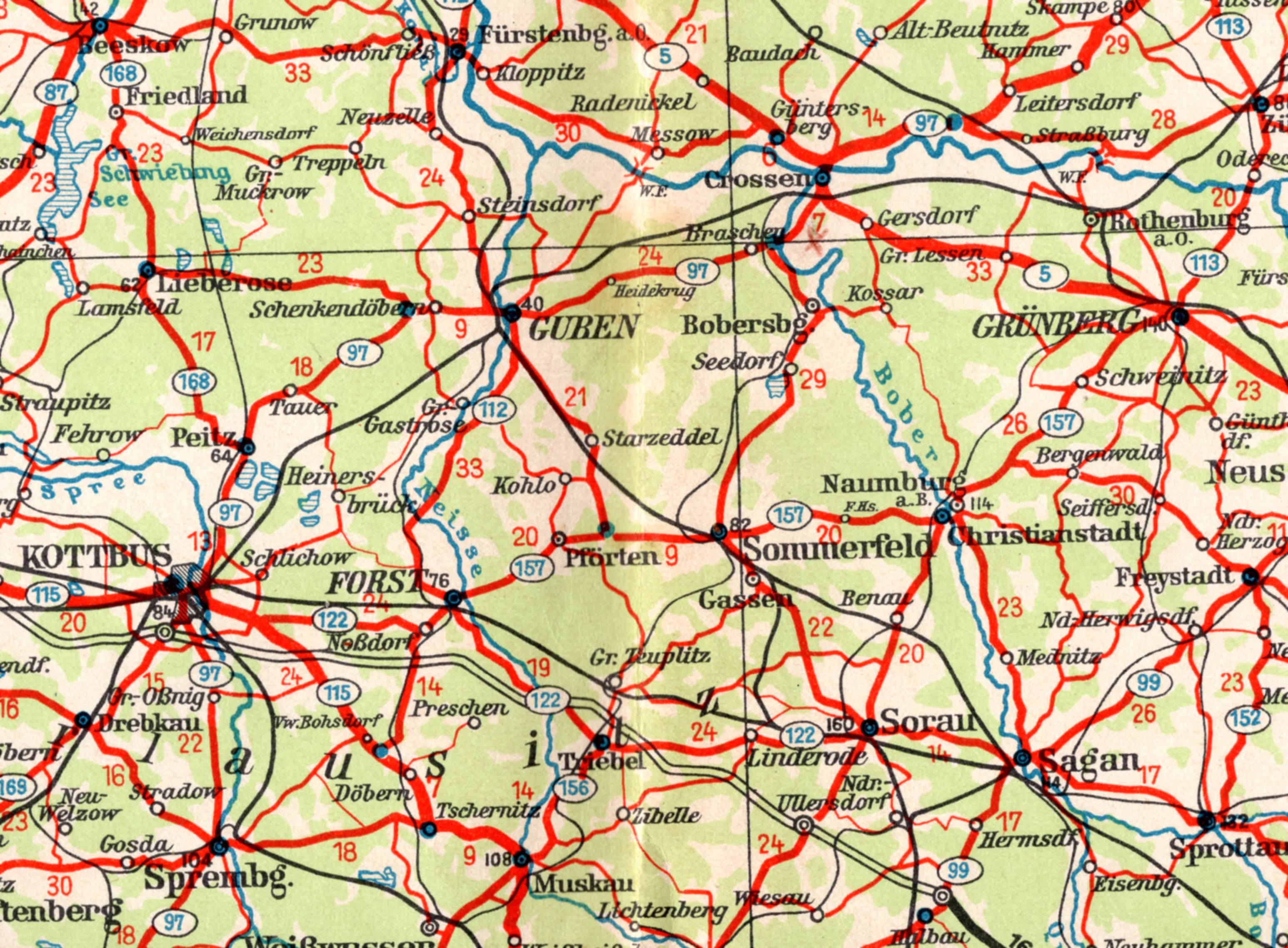 • Reichsstraße 157 : Cottbus – Forst – Pförten – Sommerfeld – Christianstadt - Naumburg/Bober – Grünberg