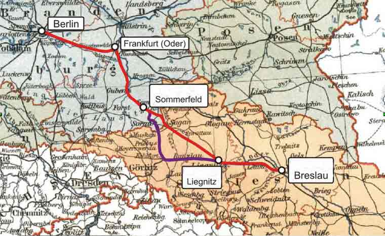 Die Hauptstrecke Berlin - Breslau: von Guben - Sommerfeld - Sorau bzw. Sagan nach Breslau.